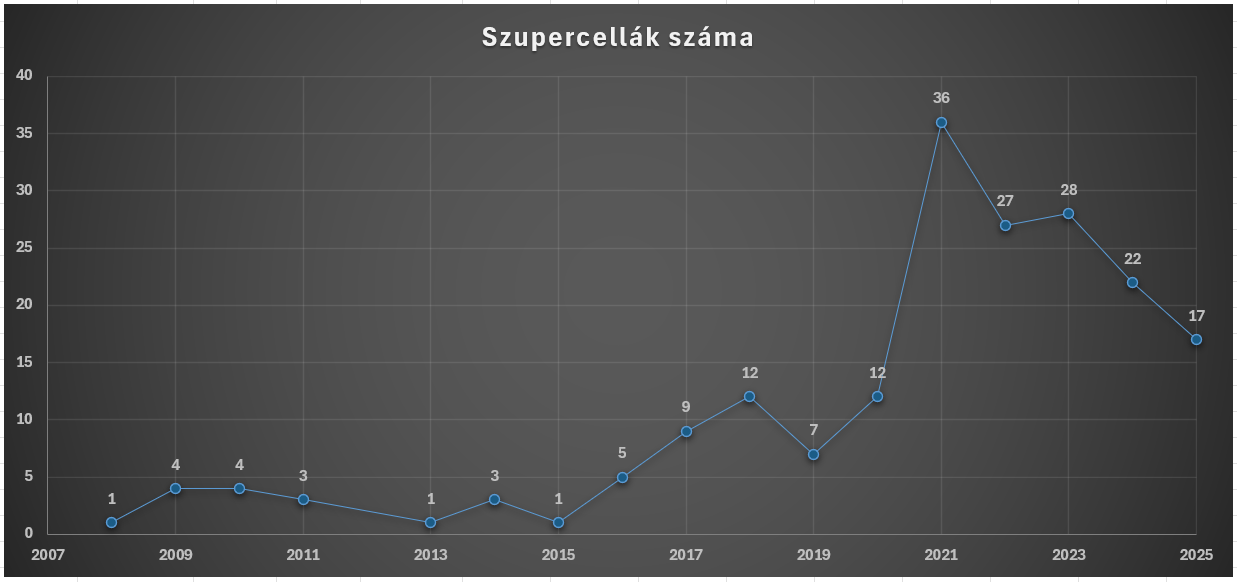 Az idei évben átlagosnál sokkal korábban indult be a zivatarszezon, meglehetősen szokatlan módon már március 11-től előfordultak zivatarok az országban. Szeptember 30-ig összesen 17 szupercellás zivatar alakult ki: 4 márciusban, 1 áprilisban, 3 májusban, 2 júniusban, 4 júliusban, 1 augusztusban, illetve szeptemberben 2.