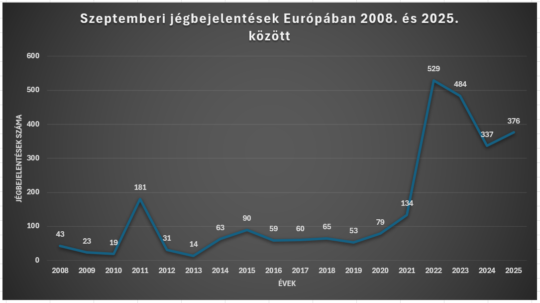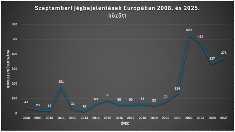 Az ESWD adatbázis alapján az elmúlt 17 év időtávlatában 2025. szeptemberében történt a harmadik legtöbb jégbejelentés.