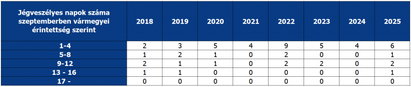 Jégveszélyes napok számát illetően szeptemberben csak 1 olyan nap volt, ami legalább 13-16 vármegyét érintett.